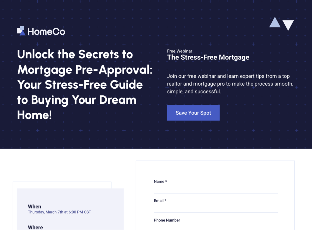 These pages are built specifically to promote an event, webinar, workshop, or virtual session. They highlight the date, agenda, speakers, and benefits, and typically include a registration form.